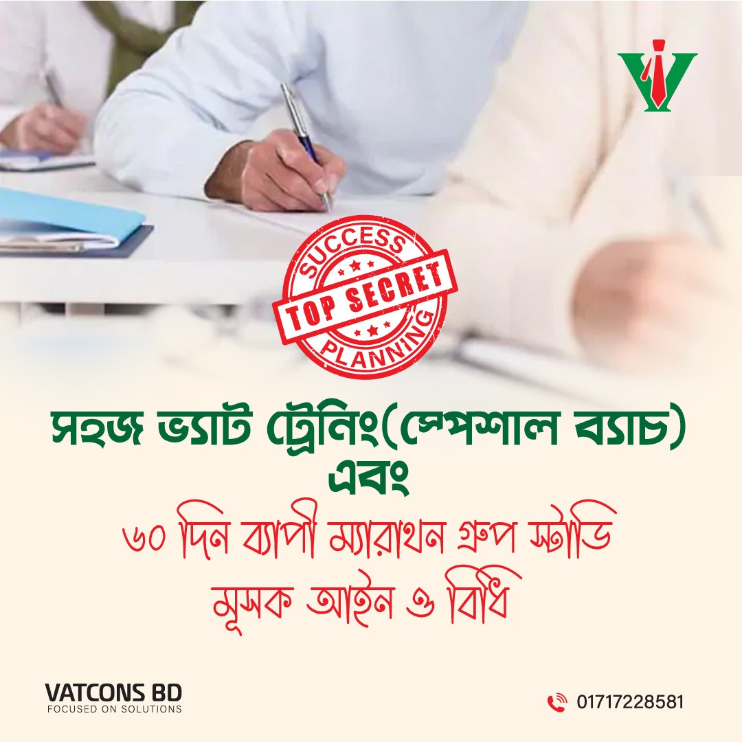 ১০ টি স্পেশাল ক্লাসের সাথে ১০ টি গ্রুপস্টাডি এবং ৬০ দিন ব্যাপী মূসক আইন ও বিধি-এর উপর ম্যারাথন স্টাডি সেশনটি ফ্রি অংশগ্রহনের সুযোগ রয়েছে। যাতে করে একজন সম্পূর্ন নতুন লার্নার পরিপূর্নভাবে বুঝে বুঝে ভ্যাটের যেকোন কঠিন বিষয়গুলো সমাধান করতে পারে।